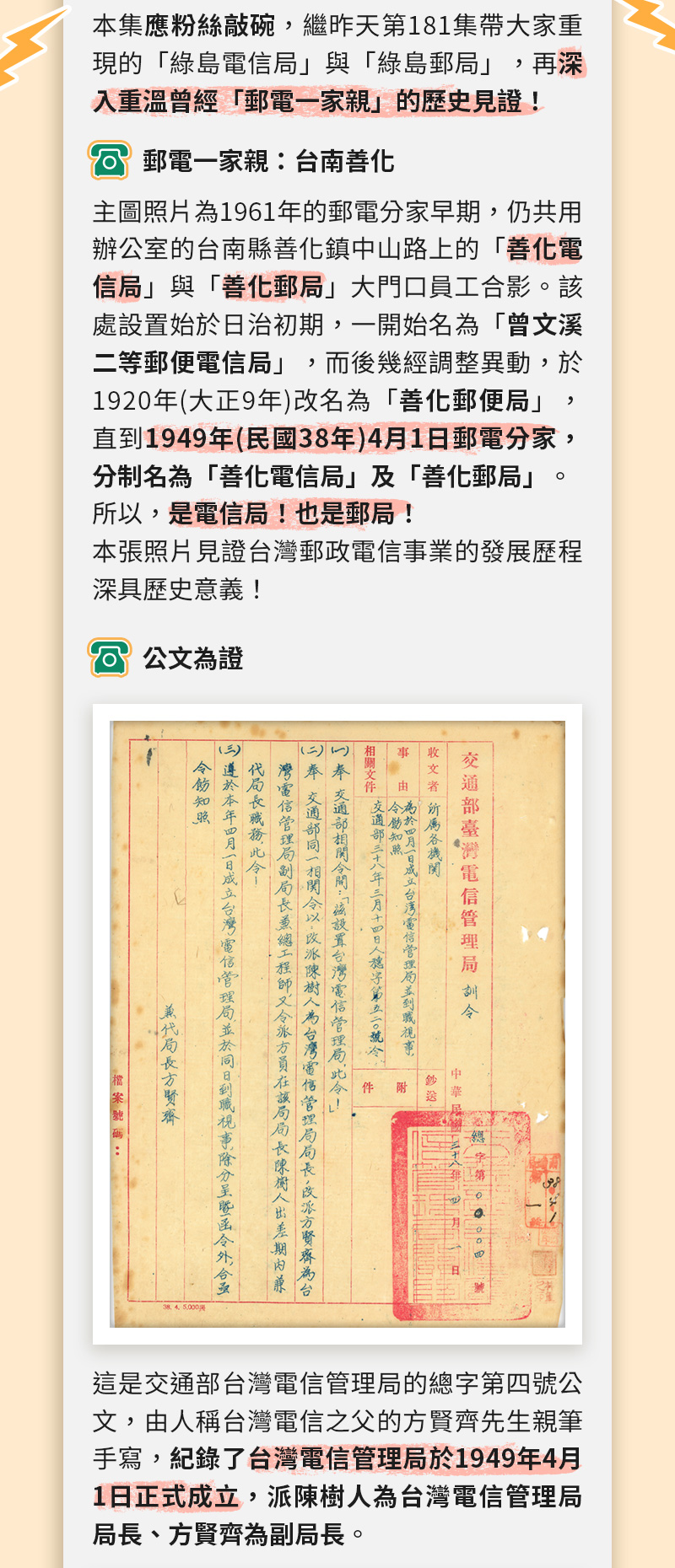 本集是應粉絲來信敲碗,想知道為什麼台灣各地「電信」跟「郵局」的服務據點,都幾乎剛好互在隔壁是鄰居?到底有什麼關係呢? 帶大家來看郵電一家親的時代故事~ 更多獨一無二的台灣百年電信故事,請上網搜尋【電信國寶守護人】。 大時代的電信風華歷歷在目,感謝故事的貢獻者,祝福故事的傳送者~ 類別:電話 | 作者:中華電信 潘儀青