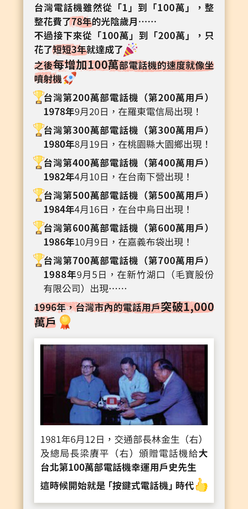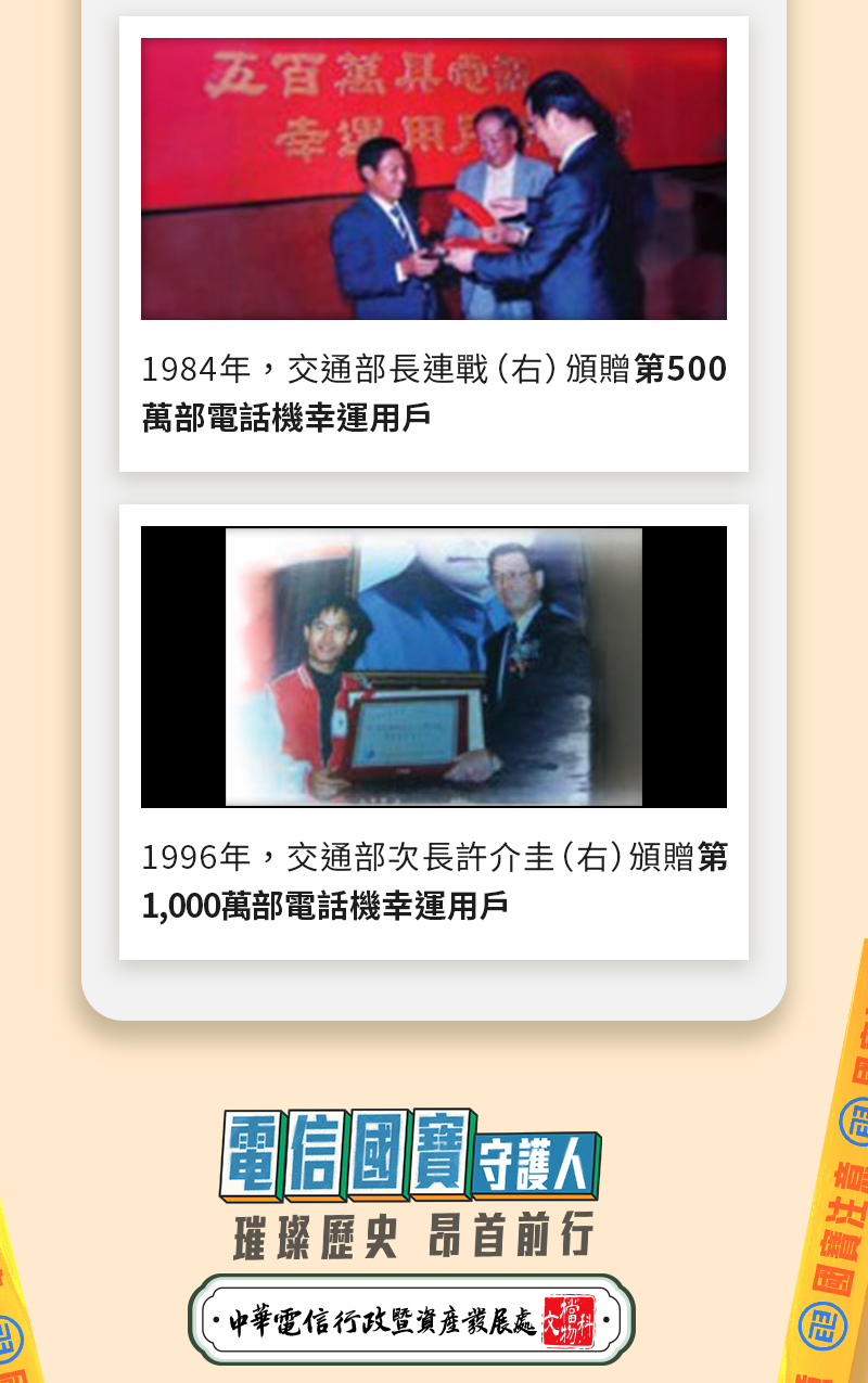 歷史,記錄著我們如何從過去走到現在的共同足跡;歷史,也啟發我們如何從現在邁向未來的無限可能。 【電信國寶守護人】不僅是共同的記憶,更是凝聚我們認同的堅實基礎。 回顧過去、努力現在、想像未來~謹以本集電子報,向台灣電信職人致敬! 轉寄希望、傳遞改變~敬請多多轉傳【電信國寶守護人】! 類別:按鍵式電話機、電話機、撥盤式電話 | 作者:中華電信 潘儀青